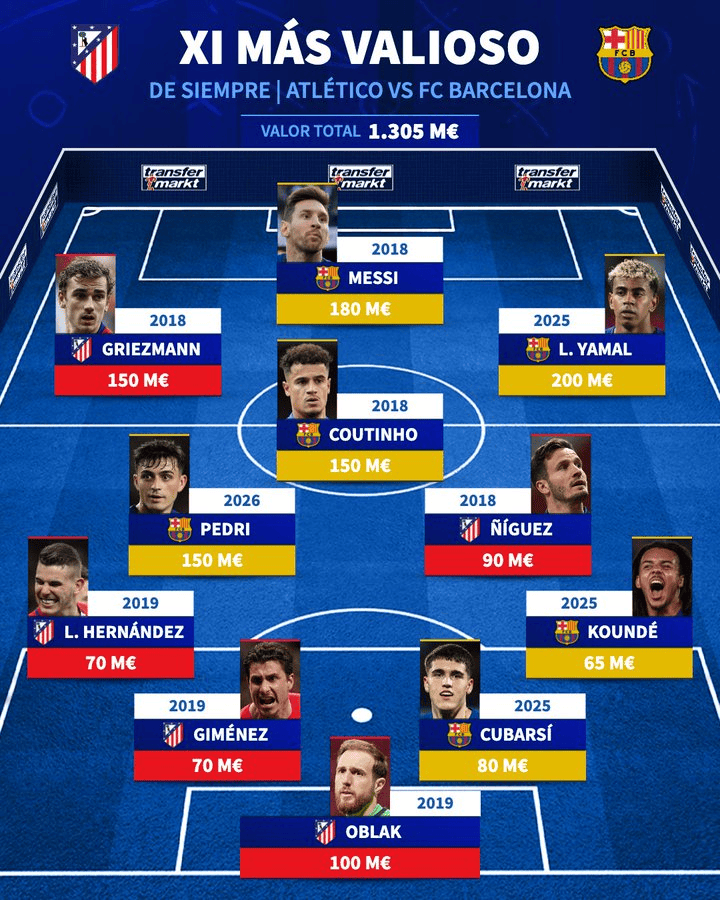 虎扑04月05日讯德国转会市场盘点了巴塞罗那、马德里竞技历史上身价最高的球员,并组成了一套最佳阵容。