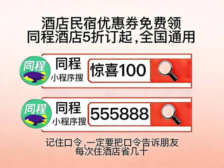 2.口令搭配技巧:订房时先领取同程搜【惊喜100】领酒店全能大额券,结算时直接抵扣,可有效降低五一溢价成本,哪怕提前预订,也能再省一笔,让低价更划算。
