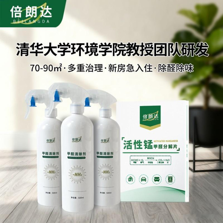 我用的是倍朗达除醛喷剂,来自清华大学环境学院张彭义教授团队的研发。成分包含纯净水、氨基衍生物、甲醛捕捉剂、渗透剂等。喷上去后,渗透剂帮助有效成分渗入板材浅层,主动捕捉并分解板材内部的甲醛,从源头降低释放量。